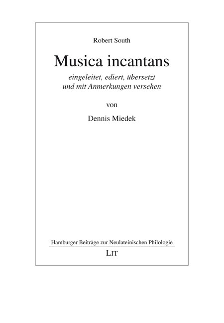 Robert South (1634 – 1716), Mitschüler von John Locke und John Dryden, ist heutzutage nur noch als Theologe bekannt. Seine in Oxford verfasste lateinische Dichtung blieb jedoch bisher unbeachtet. Das vorliegende Buch macht das im 17. Jahrhundert sehr bekannte Gedicht Musica incantans erstmals in einer textkritischen Edition mit moderner Übersetzung zugänglich. Darüber hinaus führt es in Souths Leben und Werk ein, betrachtet sein Gedicht hinsichtlich Sprache, Stil und Vorbildern näher und ordnet es in den historischen Kontext ein.
