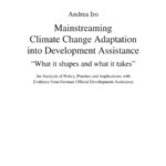 The goal of this piece of research is to learn more about the implications of climate change adaptation for development policy and practice. First, at policy level, the dynamics behind the evolution of climate change adaptation are explored to illustrate why the issue has recently turned into an expanding field for development aid agencies. Then, at practice level, the case study of Germany seeks to contribute to more detailed knowledge about possible entry points and those critical determinants driving and constraining the mainstreaming of climate change adaptation into the work of development assistance